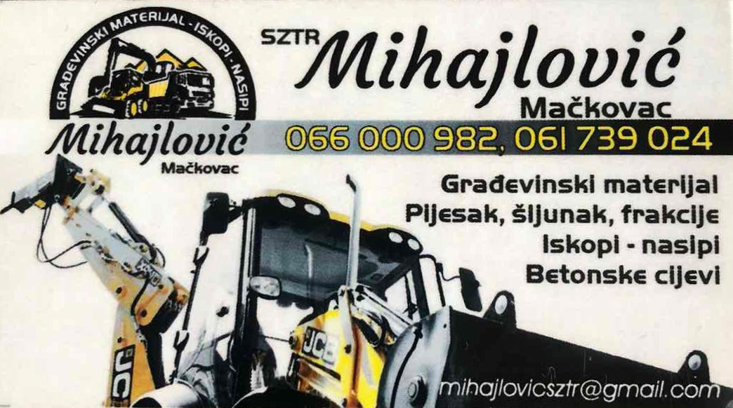 SZTR Mihajlović SZTR Mihajlović-Građevinski materijal,-Pijesak, šljunak, frakcije,-Iskopi, nasipi,-Betonske cijeviBroj telefona: 066 000 982 / 061 739 024E-mail: mihajlovicsztr@gmail.comLokacija: Mačkovac, Republika Srpska, BiH Mačkovac SZTR Mihajlović Galerija Kontaktirajte nas Adresa Mačkovac Telefon 066 000 982 / 061 739 024 Email mihajlovicsztr@gmail.com Zapratite nas Icon-internet